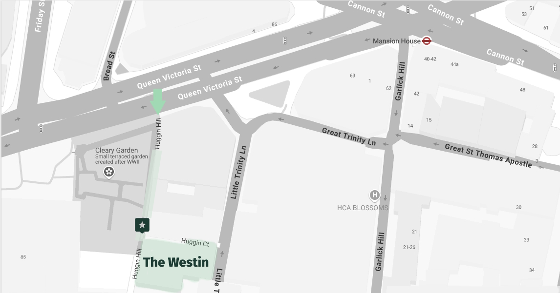 The best entrance to use for our event at The Westin is accessed via the alley named Huggin Hill off Queen Victoria Street and a 60 second walk from Mansion House, please see the following map here: